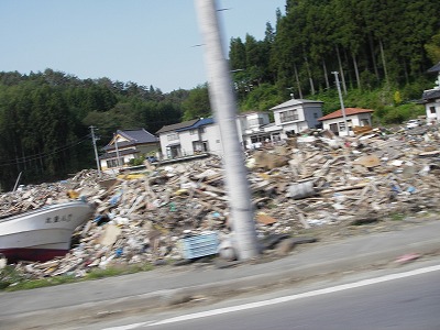 ・町はまだまだがれきの山でした。峠を越えて町に入ったとたんに船がそのままある状態です。ただ、道はかなりが