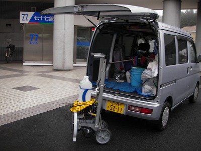 今回は事前にアリーナの佐々木氏と連絡を取り合い、会議室等のカーペット清掃を主に行うことで出かけました。