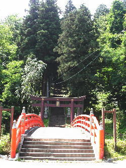 | 八幡様の鳥居。橋の下を流れているのがビンザ川。昔ここでよく泳ぎました。泳いだというより川を流れて遊んだといった方がいいかも。 | 200段の階段を上ると八幡様。 この日は新車のお払いをしてもらっている人がいました。裏から車で行けるようになってます。 |