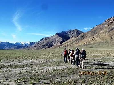 Parang Chuでの未踏峰探査が出来なくなったのは残念であるが、谷口さんの意見を入れて、のんびりとツオー・モリリの東岸を歩いて、8月23日にKarzokへ戻る気ままトレッキングを楽しむ事に全員が賛成。標高約4500mのツオー・モリリ南部の大平原を、美しい野草を見ながら、のんびりと気の向くまま歩く高原漫遊計画に変更することになった。
