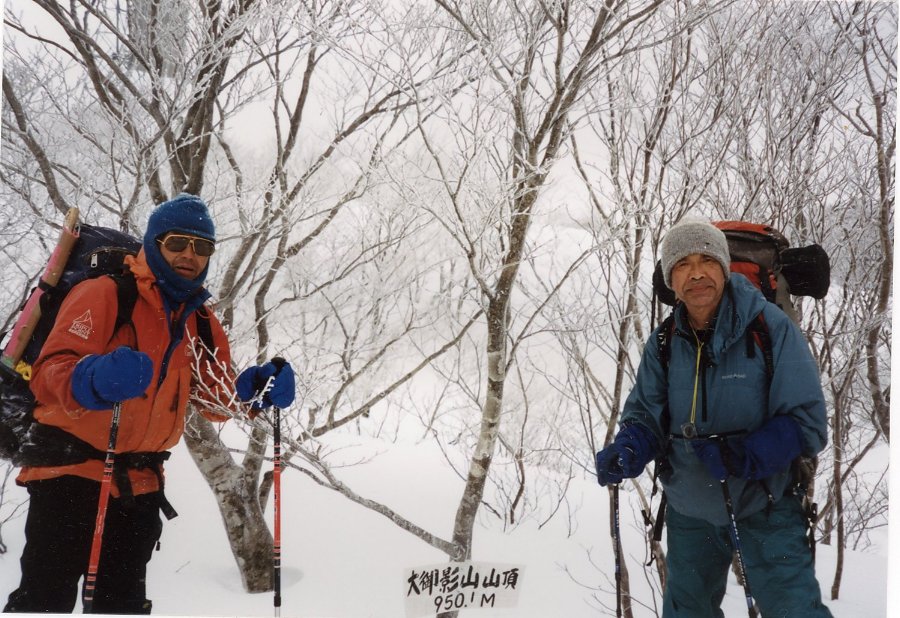 「大御影山」と書いた手書きの標識が立木にかけてあった。河内谷から沢をつめてこの山に登る登山道が出来たのだろうか?大御影山950.1mから南南西の方向に、三重嶽が雲間から姿を見せた。大御影山からは、稜線はやせた尾根となって北北西の方にのびている。左手にでる雪庇に注意しながら、ブッシュを縫うように下る。コルから、尾根は今度は少し南南西にのびて780mのピークへの登りとなる。このピークをおりると、今度は尾根は再度北北西に変わる。稜線がクネクネと曲がっていて、複雑きわまりない地形だ。ここからジャンクション・ピーク迄の登りは、次から次へと小山があらわれ3時間強の厳しいラッセルの登りであった。遙か北の雲谷山786.6mからくる尾根とのジャンクション・ピークには、「三重嶽入り口。登山道未整備」の標識が立木にぶら下げられていた。その横の立木に巻いた黄色と黒のテープにH15/11/24とマジックインキでの書き込みがあった。北の耳川の支流能登又谷から北方稜線に上がる夏道を、三重嶽まで延長させようとの試みがなされているのだろうか?このジャンクション・ピークから我々は進路を南にとり、三重嶽を目指す。風雪が又激しくなり出した。北西の強い風が吹き出し、気温も急速に下がってきた。西高東低の冬型気圧配置になってきたらしい。少し早いがジャンクション・ピークの次の858m峰の広い林の中に幕営した。